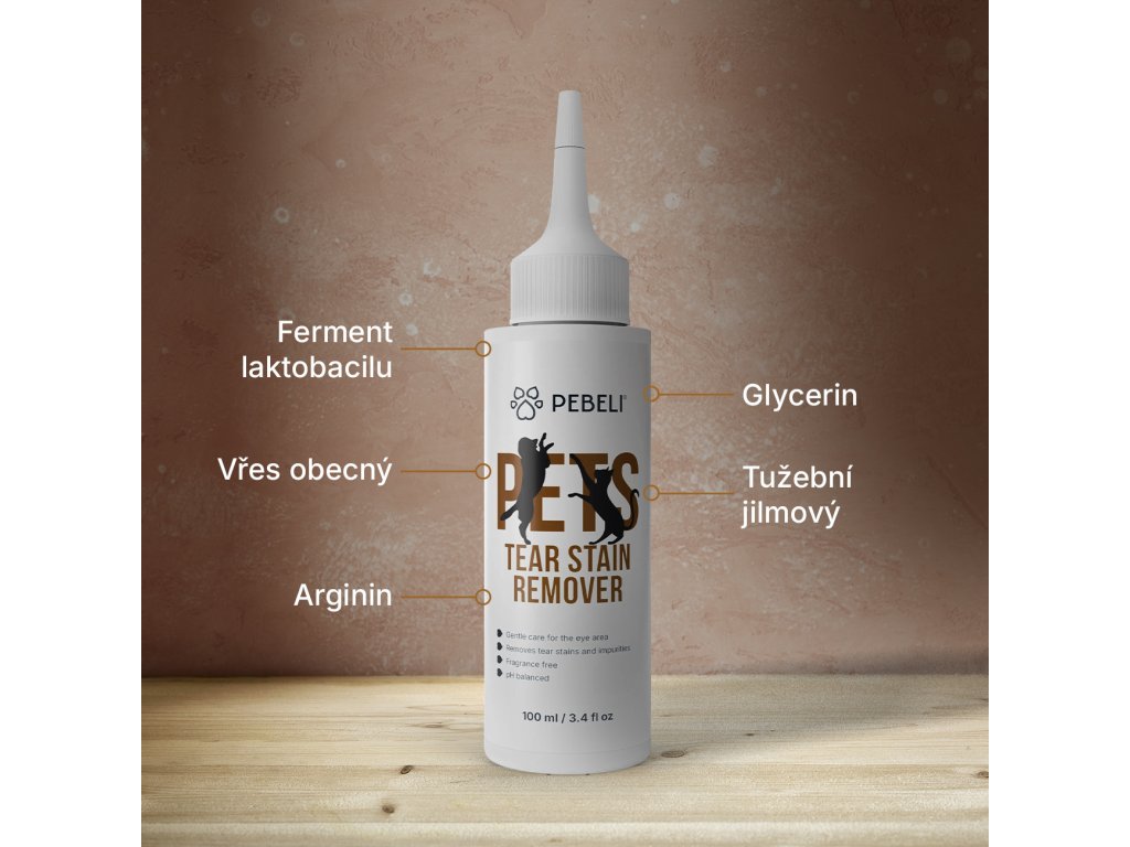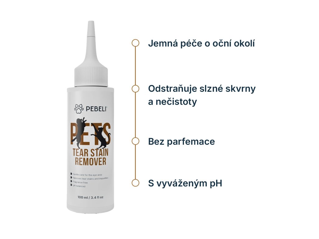 Přírodní roztok na čištění očního okolí. Jemně a bezpečně pečuje o citlivou srst psů i koček, aby se na vás mohly upírat ty nejupřímnější psí nebo kočičí oči bez nepříjemných skvrn. Díky glycerinu a rostlinným extraktům z vřesu a tužebníku zklidňuje, hydratuje a s pomocí probiotických fermentů zároveň podporuje zdravou mikroflóru a chrání před podrážděním. Výsledek? Čistá, hebká a zdravě vypadající srst kolem očí, která podtrhne tu nejkrásnější věc na světě – pohled vašeho chlupatého parťáka. PEBELI je péče srovnatelná se psím salónem. Packu na to!