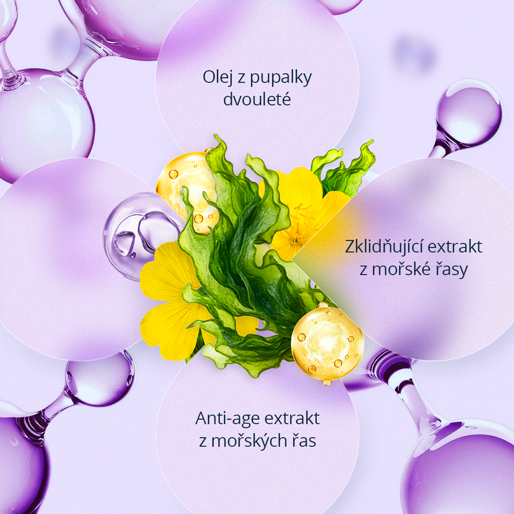 • Rostlinné oleje (v čele s olejem z pupalky dvouleté) poskytují výživu, regeneraci a komfort